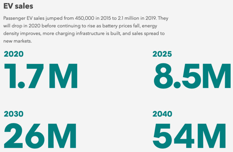 2020年受疫情影響,全球電動(dòng)車銷量將為170萬輛,低于2019年的210萬輛,但2021年以后市場反彈。預(yù)計(jì)到2025年銷量可達(dá)850萬輛、2030年2600萬輛、2040年5400萬輛。