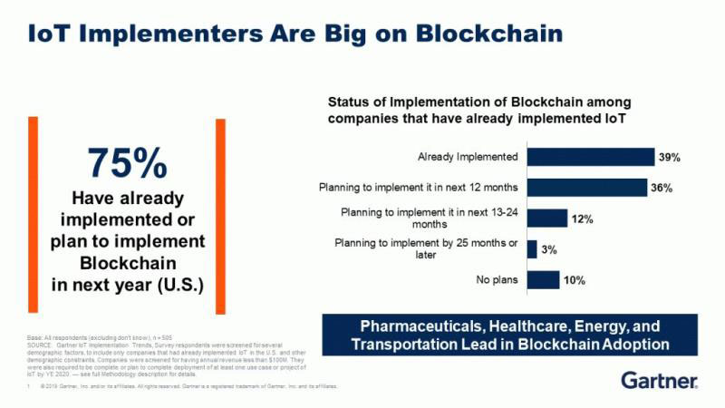 北美有75%的物聯(lián)網(wǎng)技術(shù)采用者,已經(jīng)或計(jì)劃在2020年底使用區(qū)塊鏈。而在區(qū)塊鏈的用戶中,有86%已在各種項(xiàng)目中同時(shí)實(shí)施了區(qū)塊鏈和物聯(lián)網(wǎng)這兩種技術(shù)。這些比例遠(yuǎn)高于Gartner的原本預(yù)期。