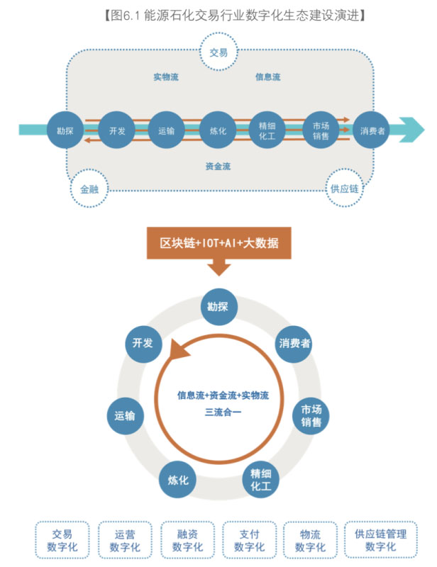 根據(jù)白皮書的分析,區(qū)塊鏈通過逐步實(shí)現(xiàn)能源石化交易行業(yè)的信息流、實(shí)物流和資金流的數(shù)字化,解決三流割裂的問題,完成產(chǎn)業(yè)鏈數(shù)字化基礎(chǔ)設(shè)施的建設(shè),促進(jìn)產(chǎn)業(yè)價(jià)值傳遞。