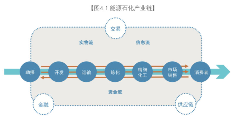 以石油為主的能源石化產(chǎn)業(yè)鏈,從上游的勘探開發(fā)、到中游煉油化工、再到下游終端市場(chǎng)銷售,主要特點(diǎn)為鏈條長(zhǎng)、周期長(zhǎng)、參與方眾多,同時(shí)涉及龐大且復(fù)雜的跨境交易和國(guó)際結(jié)算。