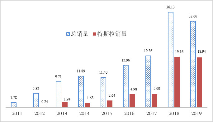圖1 美國(guó)歷年BEV和PHEV總銷(xiāo)量及特斯拉銷(xiāo)量(萬(wàn)輛)