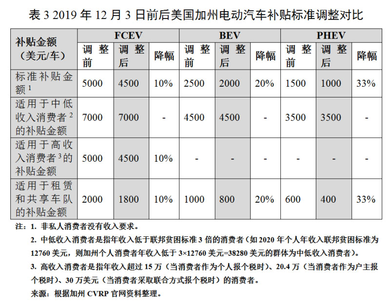 2019年底加州對(duì)CVRP進(jìn)行了新一輪調(diào)整:補(bǔ)貼金額退坡、技術(shù)門(mén)檻提高。2014年以來(lái),CVRP政策雖屢次調(diào)整,但單車(chē)標(biāo)準(zhǔn)補(bǔ)貼金額基本維持不變。然而隨著加州電動(dòng)汽車(chē)市場(chǎng)規(guī)模增長(zhǎng),補(bǔ)貼申請(qǐng)需求大幅增加,項(xiàng)目預(yù)算往往無(wú)法支撐到每財(cái)年結(jié)束,為減緩預(yù)算資金的消耗速度,使更多需要補(bǔ)貼資金的人受惠,從而實(shí)現(xiàn)更有意義的市場(chǎng)激勵(lì)效果,CARB對(duì)CVRP政策進(jìn)行了修改,并于2019年12月3日起實(shí)施:一是下調(diào)單車(chē)補(bǔ)貼金額。針對(duì)私人消費(fèi)者(除低收入群體外)的標(biāo)準(zhǔn)單車(chē)補(bǔ)貼金額統(tǒng)一下調(diào)500美元;針對(duì)租賃和共享車(chē)隊(duì)申請(qǐng)者的單車(chē)補(bǔ)貼金額統(tǒng)一下調(diào)200美元。二是限制車(chē)價(jià)。除FCEV以外,廠商指導(dǎo)價(jià)超過(guò)6萬(wàn)美元的車(chē)型(如特斯拉Model S和Model X)自2019年12月3日起不再享受補(bǔ)貼。三是提高技術(shù)門(mén)檻。PHEV純電續(xù)駛里程要求由20英里提升至35英里(約56公里)。四是加嚴(yán)申請(qǐng)次數(shù)限制。非租賃和共享車(chē)隊(duì)消費(fèi)者,享受補(bǔ)貼的次數(shù)上限由2次降低為1次。