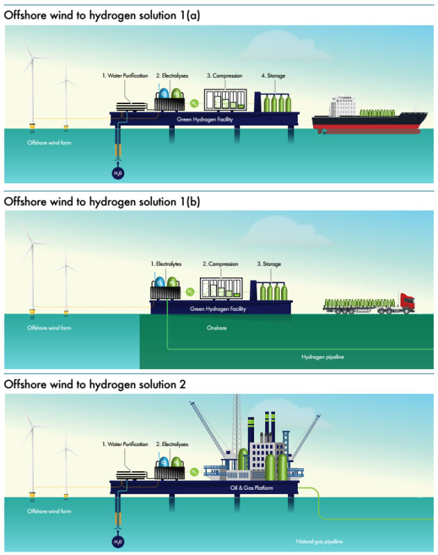 實(shí)現(xiàn)氣候目標(biāo)的關(guān)鍵是海上風(fēng)電制氫。在所有可再生能源制氫的選擇中,海上風(fēng)電最有潛力,它的規(guī)模和技術(shù)創(chuàng)新帶來了很強(qiáng)的經(jīng)濟(jì)競爭力,成本在過去幾年不斷下降。目前,被廣泛開發(fā)的海上風(fēng)電制氫解決方案有兩種,如下圖所示。第一種方案中,過剩的海上風(fēng)電將用來電解水產(chǎn)生氫氣和氧氣,氫氣被壓縮、存儲(chǔ)、轉(zhuǎn)運(yùn)。如果有海上氫化平臺(tái),還可以就地轉(zhuǎn)化為合成天然氣或氨?;?qū)㈦娊庋b置布置在岸上,氫氣直接通過管道或卡車運(yùn)輸。另一種方案是將電解裝置布置在海上油氣平臺(tái)上,利用多余的海上風(fēng)電電解水制氫,然后將氫氣混進(jìn)已有的天然氣管線進(jìn)行運(yùn)輸,預(yù)計(jì)天然氣中可以混入最多20%體積的氫氣。目前歐洲、澳大利亞已有不少綠氫項(xiàng)目正在規(guī)劃建設(shè)中。