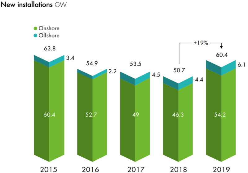 2019年全球新增風(fēng)電裝機(jī)容量為60.4GW,新增比2018年多19%,是歷史上新增第二多的年份,僅次于2015年新增的63.8GW。