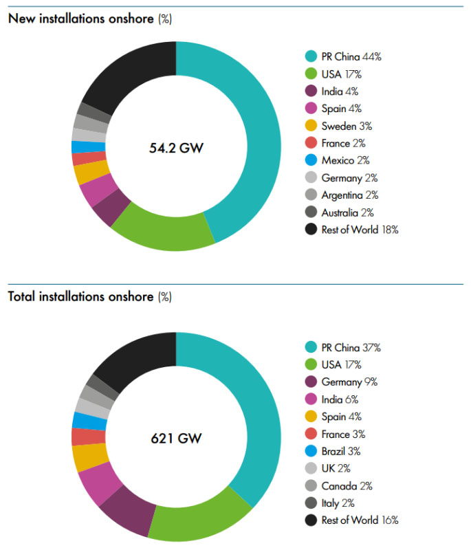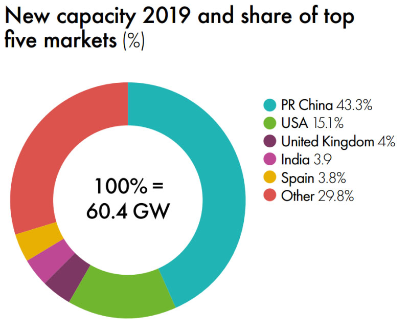 中國和美國仍是全球最大的陸上風(fēng)電市場,兩國合計(jì)占2019年新增裝機(jī)容量的60%以上。