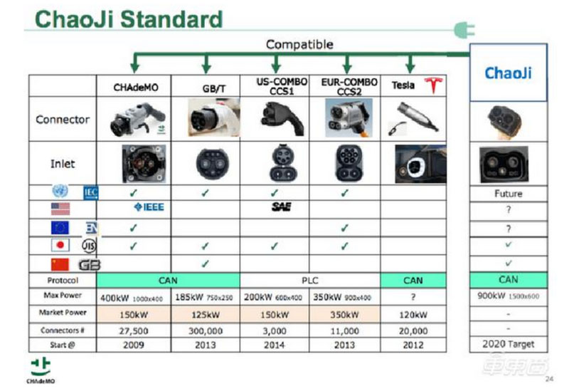 在這套標(biāo)準(zhǔn)下,充電器和電纜的體積都將會(huì)縮小,采用了和GB / T協(xié)議相同的插頭,將能夠兼容此前的CHAdeMO版本、GB / T、CCS等不同標(biāo)準(zhǔn)的快充系統(tǒng),未來(lái)還可能會(huì)適配特斯拉。