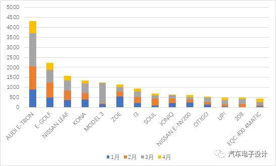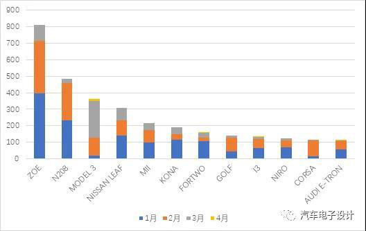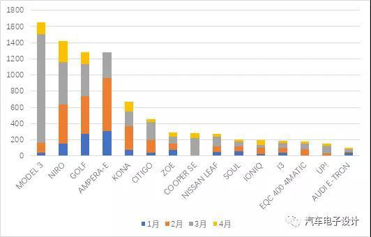 在細(xì)分車型的角度來看,基本主要的車型都陷入了低銷量狀態(tài),比如Model 3又回到了100多臺的狀態(tài)。而且整體的分布比較少,這個去年特斯拉第一大歐洲市場,今年會陷入到一個群雄割據(jù)的局面,排在后面的Niro EV+KONA、E-Golf(按照MEB目前的狀態(tài),E-golf還要多堅持一段時間)、Ampera-E。很奇怪E-tron和奔馳EQC這些豪華電動汽車在荷蘭賣得不是特別好。