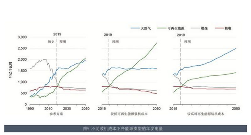 例如,技術(shù)成本變化所帶來的不同結(jié)果如圖4、圖5所示。由此可以看出,諸如成本和政策等因素為可再生能源帶來的影響仍舊會(huì)非常明顯。