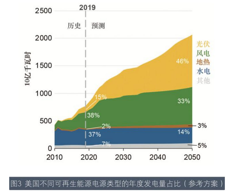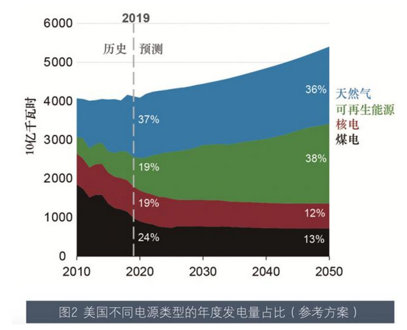 報(bào)告認(rèn)為美國(guó)電力系統(tǒng)還將經(jīng)歷快速變化,在聯(lián)邦稅收抵免政策(PTC)和州級(jí)可再生能源目標(biāo)的支持下,伴隨著風(fēng)電和光伏成本的穩(wěn)步下降,到2050年,可再生能源將成為增速最快的電源。隨著電力負(fù)荷的緩慢增長(zhǎng)和 可再生能源發(fā)電量的快速增加,美國(guó)燃煤和核電發(fā)電量將會(huì)下降。