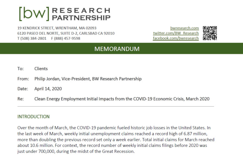 在清潔能源領(lǐng)域,由于居家禁足,節(jié)能工作人員不能進(jìn)入工作場地,太陽能、風(fēng)電、電動車企業(yè)也在解雇工人,因?yàn)闊o法裝配機(jī)器和零件,并且資金鏈也已斷裂。根據(jù)美國BW Research公司的數(shù)據(jù)分析,僅在2020年3月,美國就有超過106,000名清潔能源從業(yè)人員(可再生能源,能源效率,清潔車輛和其他清潔能源)失去工作,這已經(jīng)抵消了2019年清潔能源領(lǐng)域的所有就業(yè)增長。BW Reearch公司預(yù)計(jì)在接下來的幾個月中,美國清潔能源領(lǐng)域?qū)懈嗟牟脝T。