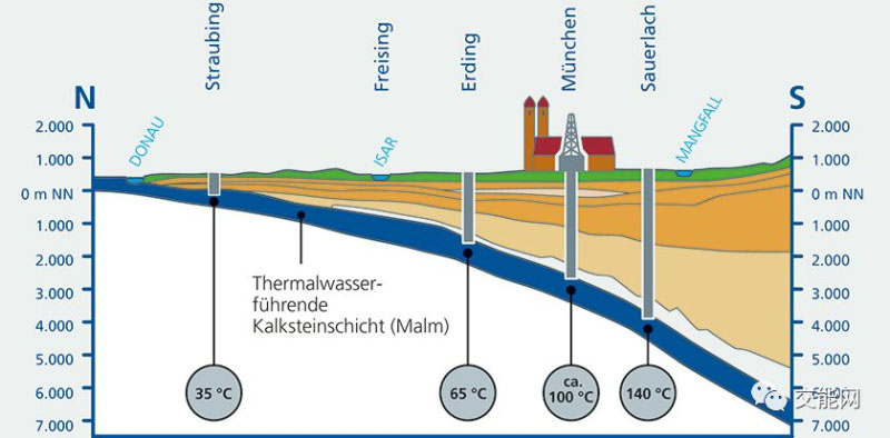 位于慕尼黑及其周邊的巴伐利亞磨拉石盆地是德國最大的潛在地熱能資源之一。地下2000米到4000 米有80到140攝氏度的熱水儲藏。因此慕尼黑市計劃在2040年成為第一個區(qū)域供熱系統(tǒng)完全由可再生能源供給的德國城市,其中地熱能為供熱的主要來源。