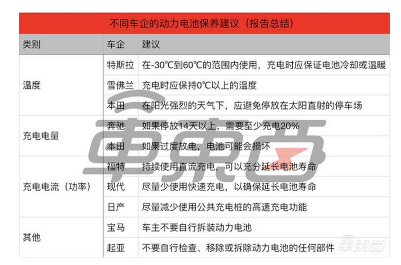▲報(bào)告總結(jié)不同車企動力電池保養(yǎng)建議