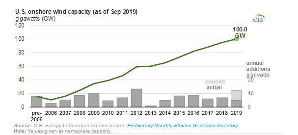 根據(jù)美國(guó)能源信息管理局(EIA)數(shù)據(jù),截至2019年9月,美國(guó)的陸上風(fēng)電累計(jì)裝機(jī)容量已超過(guò)100GW,到2020年底可能達(dá)到122GW。