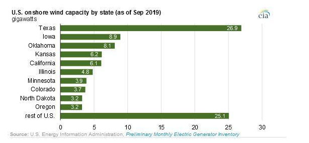 截至2019年第三季度,美國(guó)有41個(gè)州安裝了風(fēng)力渦輪機(jī)。德克薩斯州的裝機(jī)容量最大,為26.9吉瓦,其次是愛(ài)荷華州,俄克拉荷馬州和堪薩斯州。這四個(gè)州占美國(guó)總裝機(jī)容量的一半。