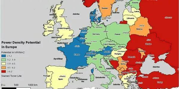 研究人員利用地理信息系統(tǒng)(GIS)的風(fēng)場空間分析,確定了可適合陸上風(fēng)電場選址的領(lǐng)土面積約占全歐洲的46%。