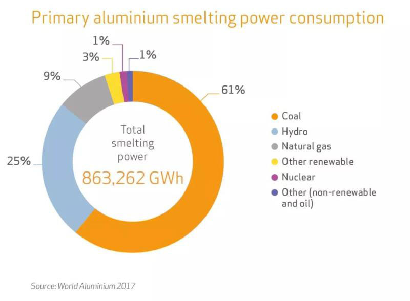 根據(jù)2017年世界鋁業(yè)報告,2017年全球制鋁耗電8632.62億度,主要來自煤電(61%)、水電(25%)、燃氣發(fā)電(9%)、非水可再生能源(3%)、核電(1%)以及其他(1%)。