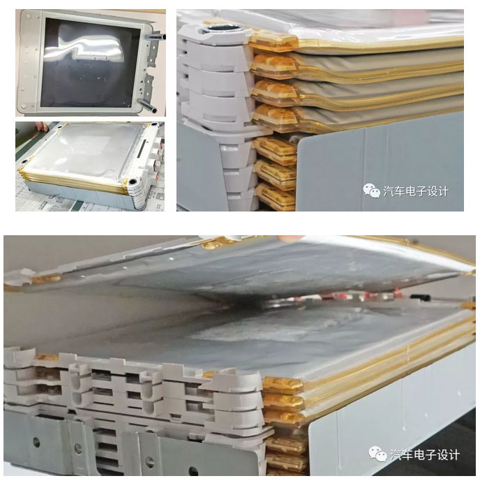 電芯表面也通過膠水進行固定,某種程度上現(xiàn)在的VDA軟包又回到了類似LEAF這樣的初始設計考慮,以進行模組的輕量化考慮。