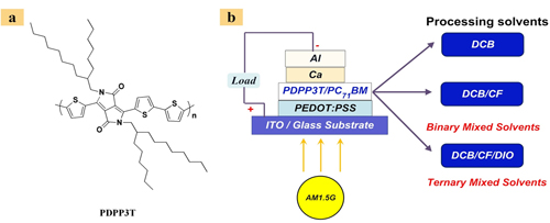 研究人員首次引入三元混合溶劑,對(duì)基于PDPP3T和PC71BM的聚合物太陽(yáng)能電池 (結(jié)構(gòu)見(jiàn)圖1) 表面形貌、本體相區(qū)、結(jié)晶行為進(jìn)行系統(tǒng)的研究,并與美國(guó)北卡羅來(lái)納州立大學(xué)(North Carolina State University)物理系的研究人員合作,運(yùn)用共振軟X射線(xiàn)衍射、二維掠入射廣角X射線(xiàn)衍射等一系列手段分析了從單一溶劑到三元混合溶劑的聚合物太陽(yáng)能電池活性層給受體形貌的演變過(guò)程。