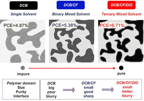 近年來(lái),形貌的優(yōu)化成為進(jìn)一步提高聚合物太陽(yáng)能電池能量轉(zhuǎn)換效率的關(guān)鍵問(wèn)題,盡管二元混合溶劑(一般是主溶劑和添加劑組成)對(duì)給受體的結(jié)晶行為和相區(qū)大小的調(diào)節(jié)已取得良好的效果,但它對(duì)更精細(xì)的形貌參數(shù),如相區(qū)純度、相區(qū)界面的調(diào)節(jié)還無(wú)能為力。