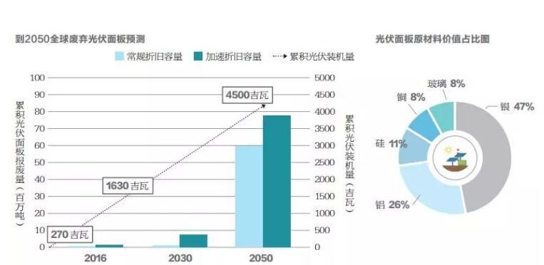 根據(jù)中科院電工所的預(yù)測,如果組件運(yùn)營維護(hù)良好,到 2034 年國內(nèi)光伏組件累計(jì)廢棄量將達(dá)到近 60 吉瓦;而如果運(yùn)維一般,屆時(shí)累計(jì)廢棄量將超過70吉瓦。而70吉瓦,已經(jīng)超過2017年光伏累積裝機(jī)量的1/2。而美國能源信息署的分析數(shù)據(jù)顯示,到2050年,中國光伏組件中或?qū)⒂?/3需要提前退役。