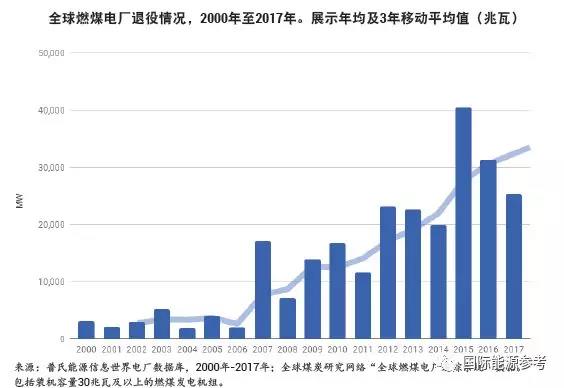 與此同時(shí),過去20年間,全球燃煤機(jī)組的退役量出現(xiàn)了大幅的上升。2015年至2017年的三年期間尤為明顯,全球共有約97吉瓦的燃煤機(jī)組退役,數(shù)量創(chuàng)歷史新高。其中,美國(guó)以45吉瓦、中國(guó)以16吉瓦、英國(guó)以8吉瓦位居前列。