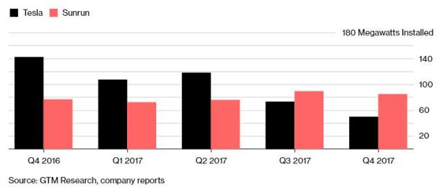 據(jù)研究公司GTMResearch估計(jì),特斯拉在去年第四季度共安裝了87兆瓦的商用和住宅太陽能,其中住宅太陽能為50兆瓦。而據(jù)周二的一份聲明顯示,競爭對手Sunrun公司在同期安裝了85兆瓦的住宅太陽能系統(tǒng)。在去年第三季度,特斯拉的住宅太陽能安裝量也不及Sunrun。