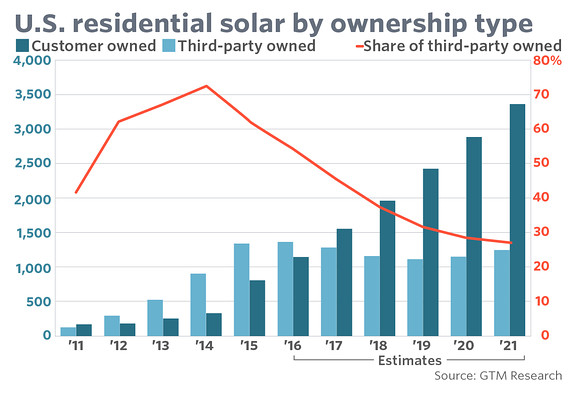 但是,SolarCity的這種模式可能無(wú)法再繼續(xù)運(yùn)行下去。市場(chǎng)研究公司GTM Research預(yù)計(jì),2017年,多數(shù)用戶將以現(xiàn)金或貸款的方式直接購(gòu)買太陽(yáng)能系統(tǒng)。GTM稱,租賃或第三方擁有的太陽(yáng)能系統(tǒng)占據(jù)了今年太陽(yáng)能系統(tǒng)市場(chǎng)的大約54%,明年將降至45%,未來(lái)5年內(nèi)將逐步降低至30%以下。