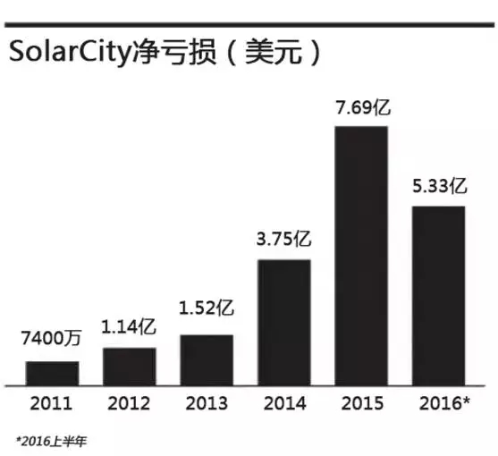 這次收購(gòu)的根本原因說白了就是SolarCity的財(cái)務(wù)面臨嚴(yán)重問題。SolarCity與用戶簽訂了免費(fèi)安裝太陽能板的長(zhǎng)期合同,在這種商業(yè)模式下,SolarCity需要巨大的前期成本。自公司成立以來,收入僅為15億美元,卻積累了30多億美元的債務(wù)。