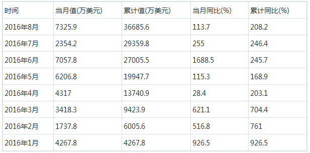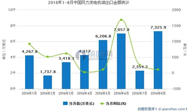 數(shù)據(jù)顯示,2016年1-8月中國風(fēng)力發(fā)電機(jī)組出口金額為36685.6萬美元,同比增長208.2%。其中,8月出口金額現(xiàn)今年最高峰,達(dá)到7325.9萬美元。2016年1-8月中國風(fēng)力發(fā)電機(jī)組出口金額統(tǒng)計表如下表所示: