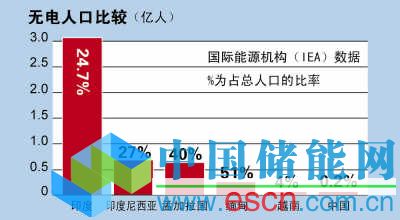 中國儲能網(wǎng)訊:亞洲2個大國中國和印度,在電力供應(yīng)方面存在巨大的差距。國際能源署(IEA)最近公布的《世界能源展望》顯示,從無法使用電力的人口占總?cè)丝诘谋壤齺砜矗?011年中國已經(jīng)基本為零,而印度則達(dá)到約25%(3億人)。尤其是在農(nóng)村地區(qū)的電力供給率方面,印度存在巨大差距。