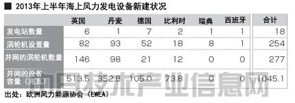歐洲風能協(xié)會公布,截至2013年6月底,在歐洲(歐盟9國及挪威)的58個風電場中,共有1939臺、合計6040兆瓦的海上風力渦輪機實現(xiàn)并網(wǎng)。另外,還有18個、發(fā)電容量共計5111兆瓦的風電場正在進行建設(shè)。
