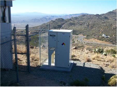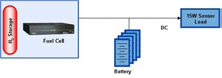 另外,離網(wǎng)設(shè)備也可使用燃料電池作為電源,如鐵路路段的故障探測器,這種設(shè)備的用電要求很低(如15W),只需為其配備一個140amph的蓄電池和175W的燃料電池就可以了(如下圖所示)。儲氫罐中儲存45~90kWh的氫氣,可以連續(xù)工作100~200天。
