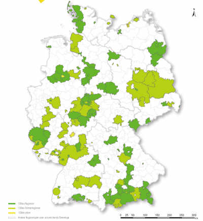 德國295個行政區(qū)域中3個縣區(qū):北弗里斯蘭、普利希尼茨、迪特馬爾申可再生能源供電量分別達(dá)到260%、261%、280%,創(chuàng)造了“能源轉(zhuǎn)型”的奇跡,成為德國乃至整個歐洲的綠色榜樣。與此同時,德國其他區(qū)域也不甘示弱,或已實(shí)現(xiàn)了100%可再生能源電力,或在不斷接近這個數(shù)值。(如圖所示)