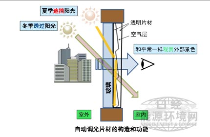 迄今為止,提高隔熱性能一直是窗戶玻璃節(jié)能的重點(diǎn)。而產(chǎn)綜研和住友化學(xué)開發(fā)的調(diào)光片材可在不降低亮度即可遮擋陽光的條件下提高節(jié)能效果,這點(diǎn)十分新穎。