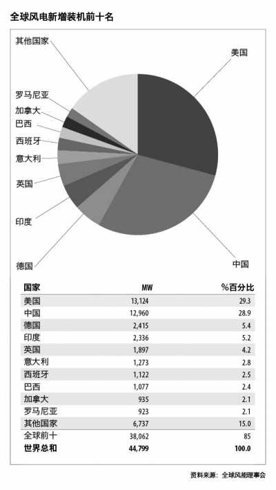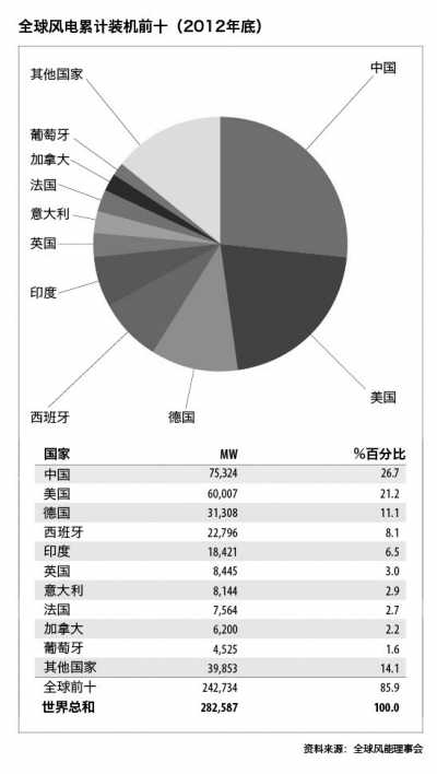 2009-2011年,中國保持年新增裝機(jī)容量全球第一的位置。而2012年美國僅以164 MW的優(yōu)勢,重回年新增裝機(jī)市場全球第一的地位。然而,美國的生產(chǎn)稅收抵免(PTC)政策推遲到2013年1月1日宣布延續(xù),意味著2013年美國市場的裝機(jī)容量將陡然下降,而后在2014年逐漸恢復(fù)。受到歐洲主權(quán)債務(wù)危機(jī)等影響,歐洲各國的國內(nèi)可再生能源政策具有不確定性,歐洲2012年的創(chuàng)紀(jì)錄的裝機(jī)容量將在很可能要到2014年才可能重演。