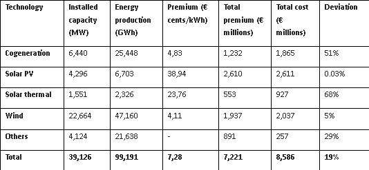 據(jù)西班牙國家能源委員會去年公布的數(shù)據(jù)透露,電力赤字已經(jīng)達到56億歐元,較2011年上漲45.7%。赤字上漲主要是由于特殊發(fā)電機制(可再生能源與熱電聯(lián)產(chǎn))成本達到86億歐元,超過預算19%(不包括光伏發(fā)電在內(nèi));海上風電補貼(巴利阿里群島、休達和梅利利亞)達到16億歐元,超過預算27%。
