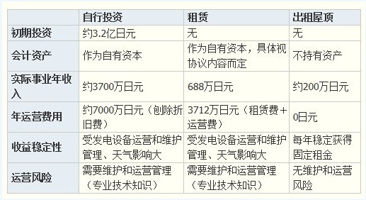 一般來(lái)說(shuō),建設(shè)百萬(wàn)瓦級(jí)太陽(yáng)能發(fā)電設(shè)施的方法有三種:(1)自行投資;(2)租賃太陽(yáng)能電池板;(3)向電力公司出租屋頂。對(duì)比這三種計(jì)劃可以發(fā)現(xiàn),出租屋頂?shù)娘L(fēng)險(xiǎn)最低(表1)。