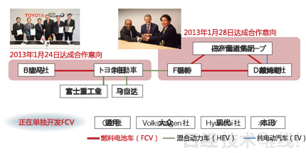 各廠商圍繞燃料電池車的開發(fā)紛紛于2013年1月底達成合作意向。豐田與寶馬攜手。日產雷諾集團與福特和戴姆勒組成聯(lián)盟。