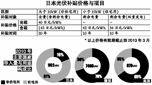 這種市場(chǎng)需求的巨量萎縮給中國(guó)光伏廠家的打擊是致命的。目前中國(guó)最大的10家光伏企業(yè)債務(wù)累計(jì)高達(dá)175億美元。無錫尚德、英利綠色能源的負(fù)債都已經(jīng)超過了30億美元,賽維LDK負(fù)債總額更是高達(dá)60億美元。面對(duì)這場(chǎng)空前的光伏大地震,光伏生產(chǎn)企業(yè)不僅需要反思之前產(chǎn)能過剩造成的種種問題,積極推動(dòng)去產(chǎn)能化,更要開發(fā)新市場(chǎng),以降低對(duì)舊有出口市場(chǎng)的依賴性。而比鄰的日本市場(chǎng)在這場(chǎng)危機(jī)中一度被視為希望的救命稻草。