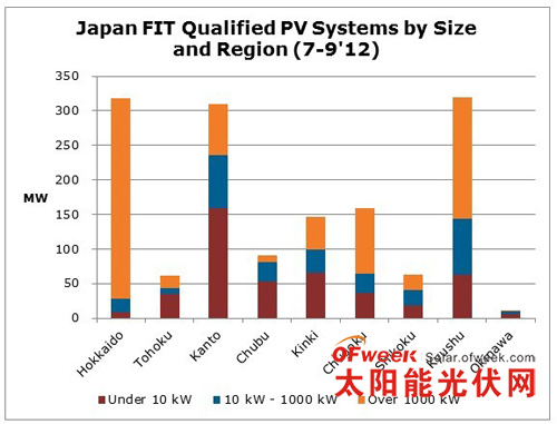 日本政府在今年7月開始實施全國上網(wǎng)電價。僅在7月到9月期間,就有接近1.5 GW的光伏項目申報并得到了補貼資格,占到了日本政府計劃在2012年7月到2013年3月期間安裝量的60%。在這1.5 GW的光伏項目中,規(guī)模大于1 MW的項目比例超過了50%。 具體到各個地區(qū)來看,九州島地區(qū)獲得補貼資格的項目總?cè)萘孔疃唷?北海道地區(qū)獲批的大型地面項目超過其他區(qū)域,主要得益于大量可利用的空地資源。而在人口密度相對較高的關(guān)東地區(qū),核準的項目以小型屋頂項目為主。