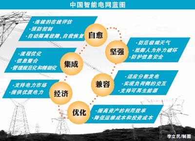 今年年初,中國國家電網(wǎng)召開2010年工作會議,規(guī)劃于2010年在電網(wǎng)建設(shè)方面投資2274億元人民幣(336億美元),智能電網(wǎng)將為投資重點。按照國家電網(wǎng)勾勒的目標(biāo),到2020年堅強智能電網(wǎng)建成后,要形成以華北、華東、華中特高壓同步電網(wǎng)為接受端,東北、西北電網(wǎng)為輸送端,連接全國各大煤電、水電、核電和可再生能源發(fā)電基地的堅強電網(wǎng)結(jié)構(gòu)。對中國而言,建智能電網(wǎng)可以實現(xiàn)全國性的電力調(diào)配,從而把清潔能源送到需要電力的地方,實現(xiàn)電力供需的實時調(diào)配,同時也推動了清潔能源的發(fā)展。