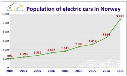挪威電動汽車協(xié)會(Norwegian Electric Vehicle Association)公布的數(shù)據(jù)(如下圖)顯示,2003年挪威電動汽車保有量為991輛,2011年底,電動汽車數(shù)量猛增至5411輛,較上年增長61%。