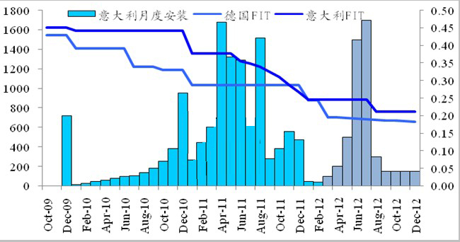 2012年一季度意大利安裝量僅有200MW左右,正常預(yù)計全年將有3-4GW的需求量,但由于“第五能源法案”草案中設(shè)置了補貼下調(diào)(15%)和補貼上限(每年2-3GW)的條款,預(yù)計二季度的搶裝將非常明顯,有望刺激需求達到5GW。