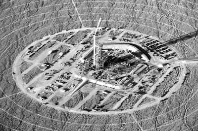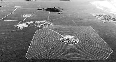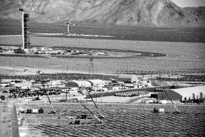 伊萬(wàn)帕太陽(yáng)能熱電廠占地1400多公頃,就在拉斯維加斯附近。它使用排列成同心圓的凹面鏡陣,把太陽(yáng)光聚焦到中央塔,形成高溫,產(chǎn)生蒸汽。這座太陽(yáng)能熱電廠采用三座中央塔,每座塔都有自己的一組凹面鏡。第一組機(jī)組在前部,今年2月完工,工人們已開(kāi)始安裝凹面鏡,在圖中左上角和場(chǎng)地右側(cè)。 |