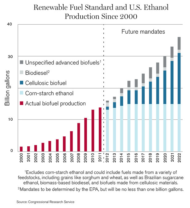 目前所生產(chǎn)的生物燃料,絕大部分是從玉米提煉出來的乙醇,對此,《可再生燃料標準》設(shè)定了限制,就是到2015年限制在150億加侖。因此,為了滿足聯(lián)邦政府的規(guī)定,到2022年,使360億加侖的生物燃料進入整體供應(yīng),美國生物燃料產(chǎn)業(yè)就必須生產(chǎn)大量其他類型的生物燃料,尤其是纖維質(zhì)乙醇,都要用木屑和草進行提煉。