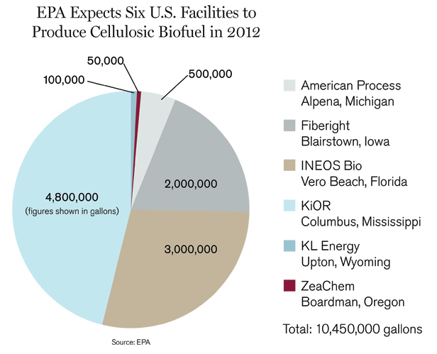 2012年,環(huán)境保護局認為,根據(jù)它的分析,有六套設(shè)備今年計劃上線,這一新生產(chǎn)業(yè)的產(chǎn)能接近1050萬加侖,相比之下,初定的目標是5億加侖。上面的圖表也表明:根據(jù)公司和設(shè)施情況,環(huán)保局下調(diào)了預測,就是對2012年纖維質(zhì)生物燃料產(chǎn)量的預測。