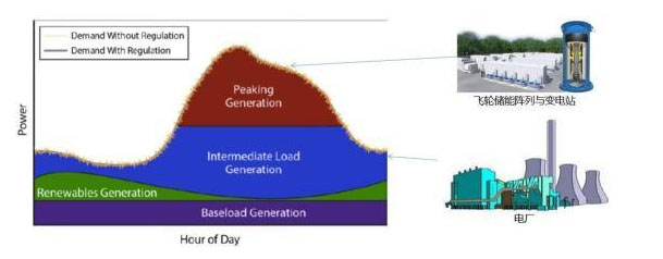 電廠將多余的發(fā)電量?jī)?chǔ)存在飛輪中,根據(jù)電網(wǎng)調(diào)度網(wǎng)絡(luò)自動(dòng)化調(diào)度指令,在 0.1s~1s 內(nèi)對(duì)需求做出響應(yīng),一天內(nèi)飛輪儲(chǔ)能系統(tǒng)可反復(fù)儲(chǔ)能、釋能10K次以上,這樣電廠整體運(yùn)行可以基本保持平穩(wěn),提高發(fā)電效率。