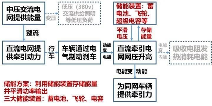 事實(shí)上,目前使用的儲(chǔ)能技術(shù)方案,比起單純地把站臺(tái)修高則要復(fù)雜和有效得多,為地鐵系統(tǒng)節(jié)能降耗提供了更多的調(diào)度和使用的靈活性,其能量流轉(zhuǎn)過程如下圖所示,儲(chǔ)能的代表技術(shù)主要有蓄電池儲(chǔ)能、電容儲(chǔ)能、飛輪儲(chǔ)能3種。