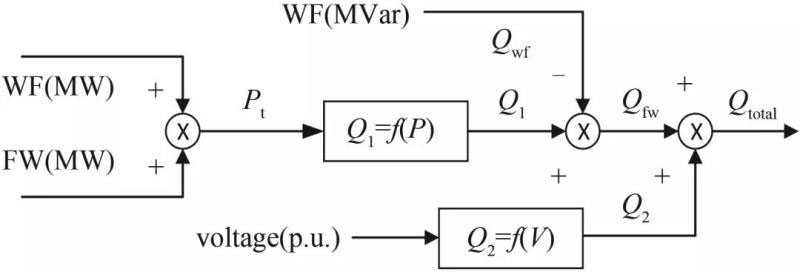 原加拿大Temporal Power公司建于安大略省Clear Creek的5 MW飛輪儲能電站,2016年2月商運(yùn)。該儲能電站主要配合附近的20 MW風(fēng)電場運(yùn)行,可以平滑風(fēng)電出力也可對風(fēng)電場提供無功補(bǔ)償。平滑出力時根據(jù)風(fēng)電實時功率和平均功率的偏差作為飛輪的參考出力;如圖3所示,提供無功補(bǔ)償時,風(fēng)電場所需無功功率分為Q1、Q2兩部分,Q1與風(fēng)電及飛輪的總有功Pt有關(guān),Q2和電網(wǎng)電壓水平V(p.u.)有關(guān)。首先確定所需無功功率Q1與風(fēng)電及飛輪的總有功Pt的若干個基準(zhǔn)關(guān)系點,剩余點可通過插值確定。所需無功功率Q2和電網(wǎng)電壓水平V(p.u.)的關(guān)系則有死區(qū)的限制,即當(dāng)電網(wǎng)電壓標(biāo)幺值低于或高于某一水平才進(jìn)行無功補(bǔ)償,Q1、Q2兩部分無功之和扣除風(fēng)電本身的Qwf后所得Qtotal作為飛輪無功出力參考值。