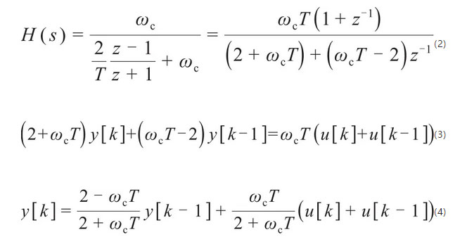 以一階巴特沃斯低通濾波器為例,其傳遞函數(shù)如式(1)所示,ωc為截至頻率,T為采樣時間。